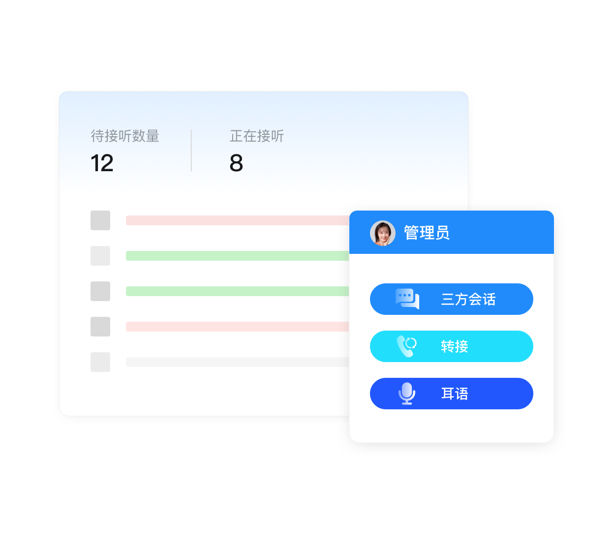 實(shí)時(shí)展示呼叫中心的接待情況,同時(shí)支持管理員進(jìn)行監(jiān)聽(tīng)、耳語(yǔ)、三方會(huì)話